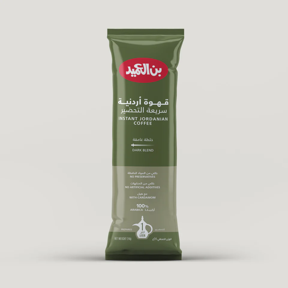 This Instant Arabic Coffee line allows you to enjoy consistent, authentic, traditional Arabic coffee in an instant.,. this Jordanian coffee blend is made of 100% Arabica coffee. and is the darkest of the family, giving you a bold prominent coffee taste wrapped with the fresh and intense green cardamom flavor. Each sachet makes 1 liter, with 6 sachets per box.
